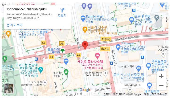 게이오 플라자 호텔과 도쿄도청사 사이에 위치, 고가도로 아래 대형버스 주차장