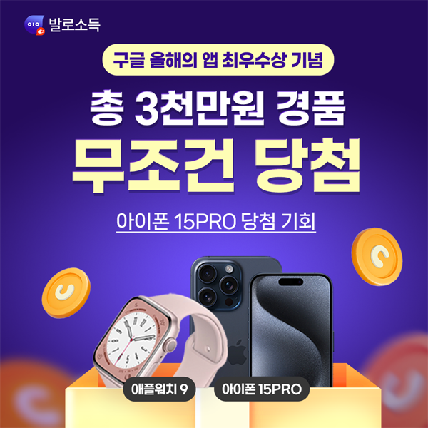 ● 발로소득, 구글 올해의 앱 최우수상 수상 기념 이벤트! 이 기쁜 소식을 친구에게 소문내주면 아이폰15 Pro, 애플워치9 를 경품으로 드려요! ● 참여 방법 1) 발로소득 앱 챌린지에서 스페셜 챌린