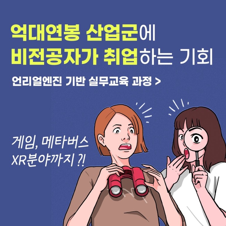 고용노동부 지원 국민내일배움카드 발급 가능자들을 대상으로 진행하는 IT기업취업 전액지원교육 서울 가산디지털단지에서 7개월 간 대면 수업으로 진행되며 언리얼엔진을 활용하여 게임, 메