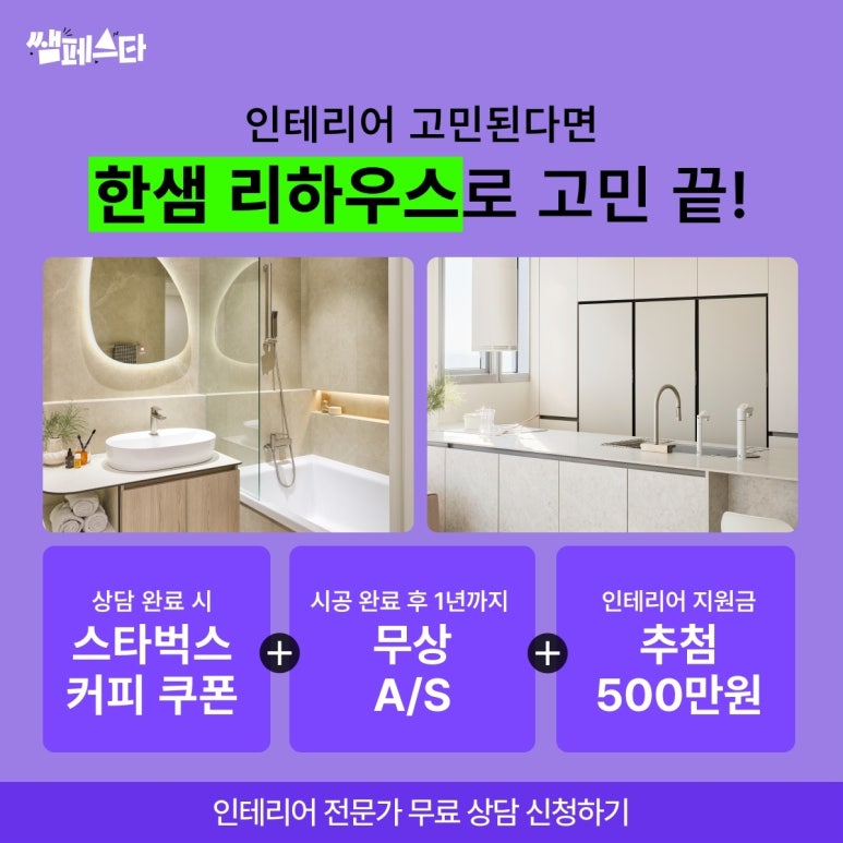 최대 혜택 받을 수 있는 쌤페스타 라스트 찬스! 한번에 해결할 수 있는 한샘에서 새집을 만나보세요. 이벤트 기간: 4월 15일까지 [상담 완료시 모두에서 스타벅스 커피 쿠폰 증정!!] *한샘 리하우