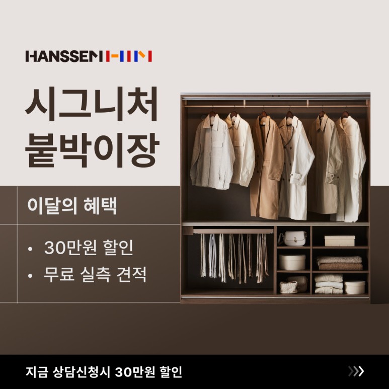 한샘 프리미엄 붙박이장, 시그니처 시스템 런칭! 더 똑똑한 수납, 한샘 시그니처 붙박이장으로 경험해 보세요. 런칭 기념 한정 기간만 진행되는 특별 혜택까지 만나보세요! *시그니처 붙박이장