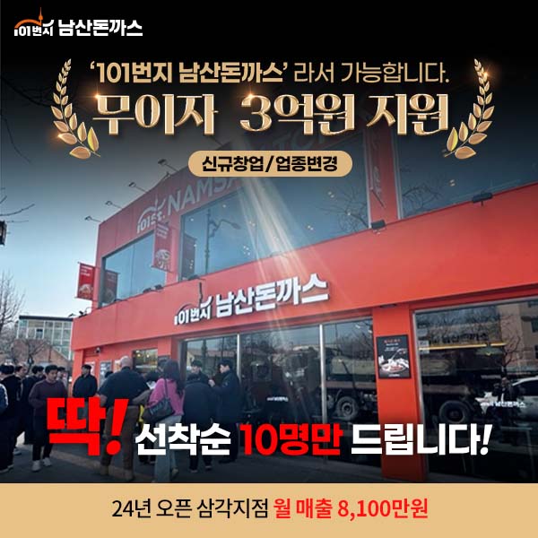 24년도 오픈한 삼각지점 월 매출 8,100만원 돌파! 무이자 3억원 본사 지원! 이 모든 게 '101번지 남산돈까스' 라서 가능합니다 딱! 선착순 10명에게만 드리니 지금 바로 문의해보세요!