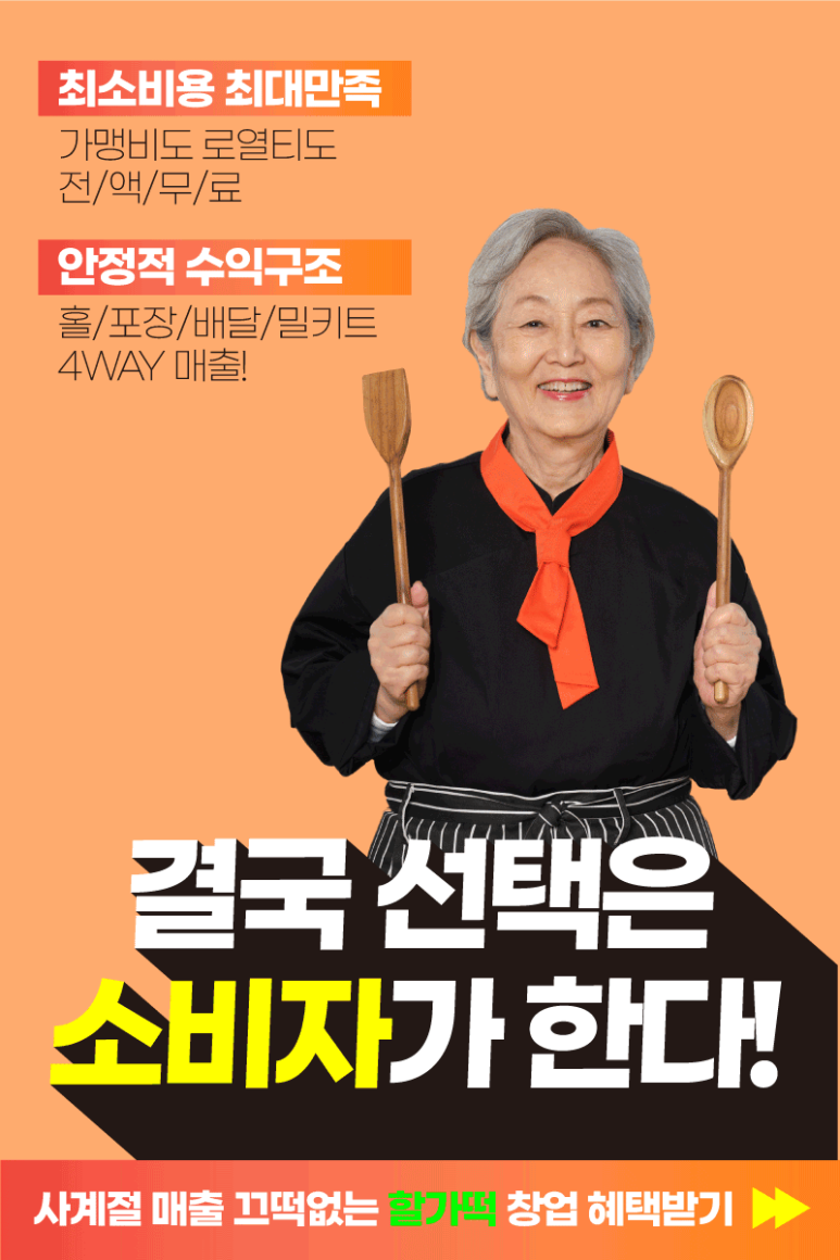- 조리가 간편하고 유행을 타지 않는 아이템 - 적은 투자비용으로 높은 매출 가능 - 가맹비, 로얄티 한시적 면제 - 인테리어 직접시공 가능 - 업종변경시 주방설비 직접구매 가능 - 배달, 홀, 포장,