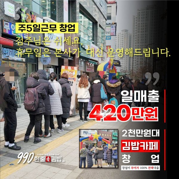 프리미엄 김밥 절반가격의 한줄애김밥라인으로 꾸준한 고정고객을 확보합니다.