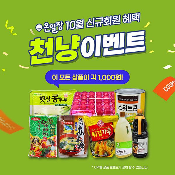 온일장 '10월 한정' 천냥 이벤트 #당일배송 #사업자전용 식재료 8가지 단돈 1,000원 지금 바로 콩식용유, 적된장, 콩두부, 튀김가루, 와사비, 스위트콘, 데리야끼소스, 계란 할인 받으세요! * 식당 사