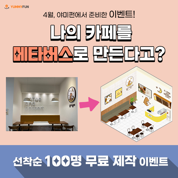 -신청대상 : 카페를 운영중인 사장님(프랜차이즈, 개인 모두 가능) -모집인원 : 100명(선착순) -신청기간 : 2023.04.06(목) ~ 100명 마감 시 메타버스 매장 -사장님의 카페를 메타버스에서도 볼 수 있어