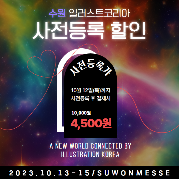 전시명 : 2023 수원 일러스트코리아 전시 일정 : 2023년 10월 13일(금) - 15일(일) 개최 장소 : 수원메쎄 *수원역 2, 3번 출구 동시개최 : 가낳지모 캣페어 당신이 그리는 세상은 무엇인가요? 작가의 무한